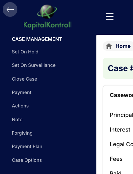 The left hand menu is available by clicking the “hamburger” to show/hide the menu. Most of the actions in the left hand menu is available on the case card directly as described in the case overview page. It makes no differenece if you use the buttons directly on the card or the left hand menu, they do the same. Case Options only exists in the left hand menu and has some advanced options to adjust your case.